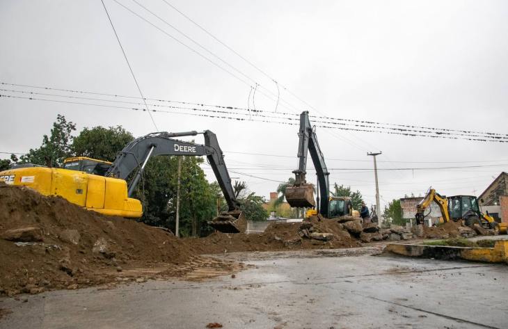 Los equipos de Vialidad y de la Dirección Provincial del Agua trabajan con maquinaria pesada —retroexcavadoras, retropalas, camiones y cargadoras— para avanzar con el reacondicionamiento y posterior repavimentación con hormigón.