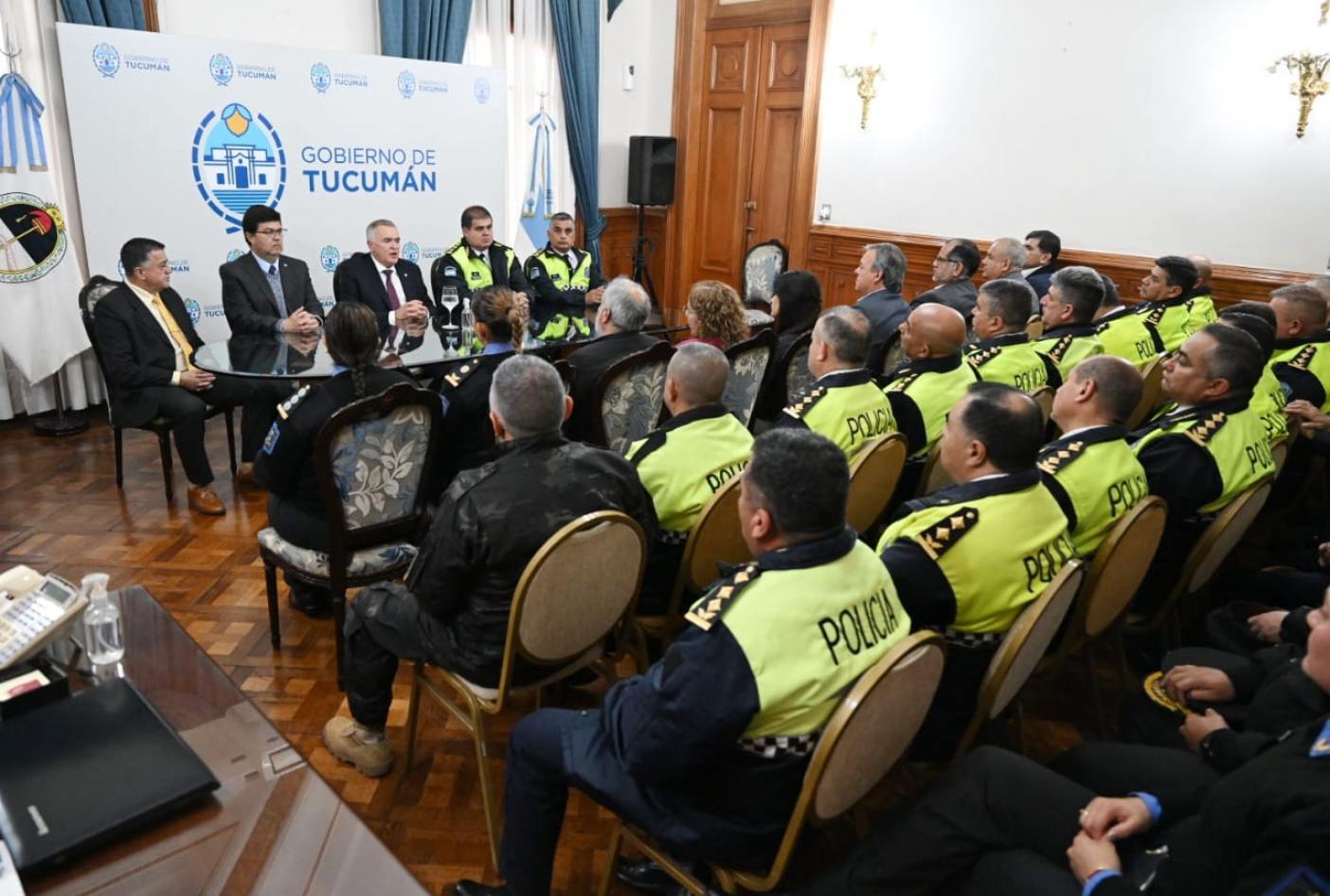 El gobernador de Tucumán, Osvaldo Jaldo, encabezó una reunión de trabajo con el ministro de Seguridad, Eugenio Agüero Gamboa; el jefe de Policía, Joaquín Girvau; el subjefe, Roque Yñigo, y el director del Servicio Penitenciario, Antonio Quinteros, para evaluar los resultados del Operativo Lapacho y analizar las estadísticas vinculadas al delito en la provincia.