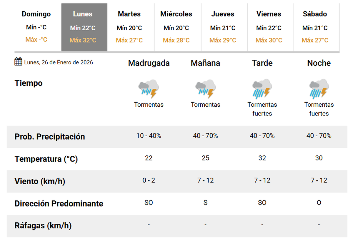 De acuerdo al informe, se espera un lunes con probabilidad de tormentas durante todo el día y con mayor intensidad durante la tarde y la noche. La temperatura mínima sería de 22°, mientras que el registro máximo alcanzaría los 32°.