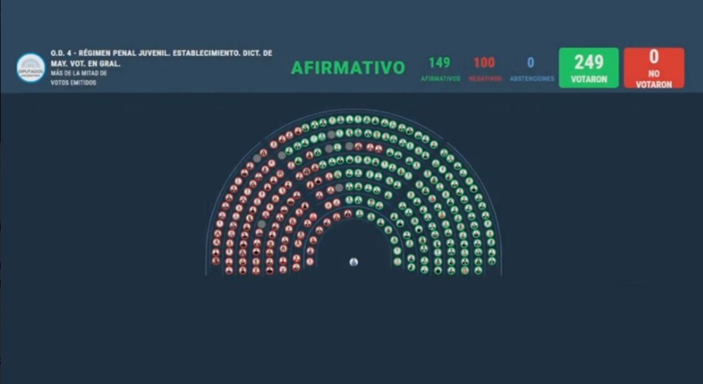 La Cámara de Diputados de la Nación Argentina aprobó y giró al Senado el proyecto de nuevo Régimen Penal Juvenil con 149 votos a favor y 100 en contra, sin abstenciones.