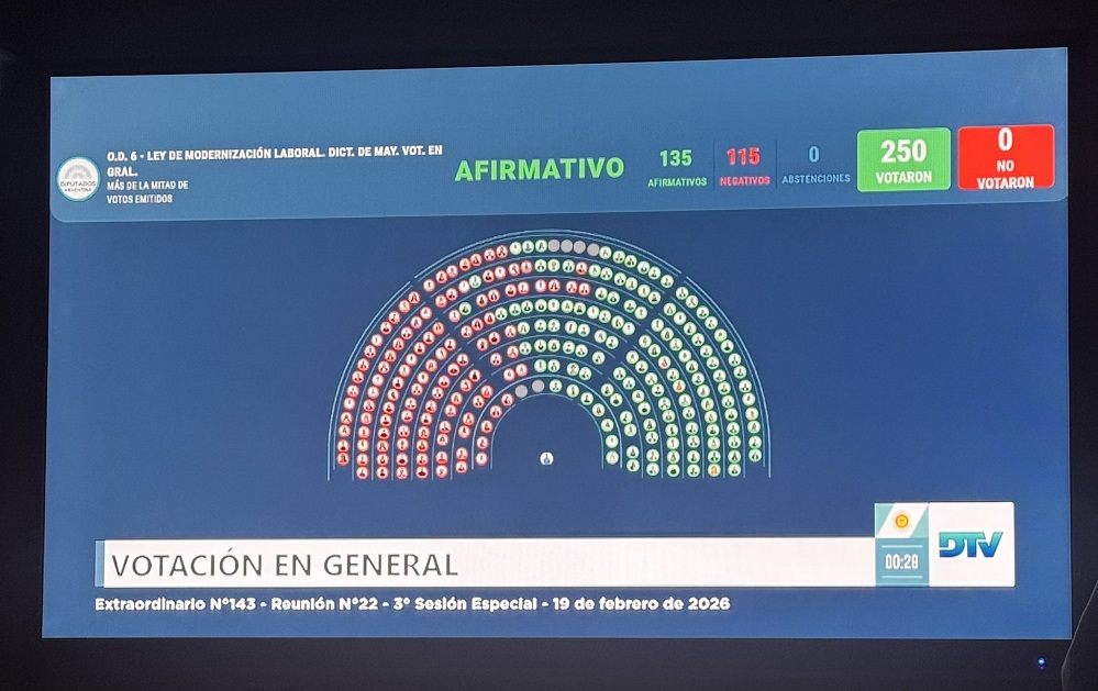La reforma laboral promovida por el Gobierno de Javier Milei obtuvo este viernes media sanción en la Cámara de Diputados, con 135 votos a favor y 115 en contra, sin abstenciones y con seis ausencias, y volverá ahora al Senado para el tratamiento de las modificaciones incorporadas al texto original.