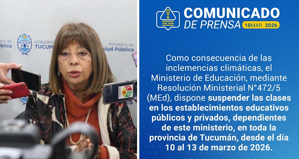 El gobernador de Tucumán, Osvaldo Jaldo, dispuso este martes la suspensión del dictado de clases en toda la provincia hasta el viernes 13 de marzo inclusive, debido a las intensas lluvias que afectan a distintos puntos del territorio.